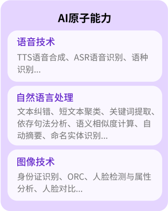 使用NLP、ASR、TTS、CV等技術(shù),為應(yīng)用開發(fā)提供文本、語音、圖像處理的API,將基礎(chǔ)AI能力原子化,通過AI接口調(diào)用、業(yè)務(wù)邏輯整合,就能實現(xiàn)AI業(yè)務(wù)需求,達(dá)到低成本、可復(fù)用、普惠AI的目的。
