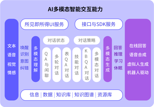 使用ASR、語義理解、對話管理、多模態(tài)生成、TTS、DNN、情感識別、知識表示與管理等技術(shù),實現(xiàn)多模態(tài)智能交互解決方案,提供所見即所得的機器人對話服務(wù),支持文本對話、語音對話、視覺和數(shù)智人對話。